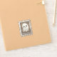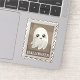 This endearing postage stamp features a sweet, plump ghost with large, friendly eyes and rosy cheeks, set against a rustic, textured brown background. The word "HALLOWEEN" is prominently displayed at the bottom, making it perfect for direct holiday greetings. Ideal for sending cheerful Halloween mail, party invitations, or for collectors seeking simple, cute, and universally appealing seasonal designs.