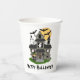 Cute Halloween haunted house and little witch paper cups, featuring a haunted house with cute ghosts, bats, black cats and a little witch.