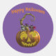 Three cute mice dressed in Halloween costumes – a witch, a devil and a jester – sit together on a smiling jack o’ lantern. They are ready for Halloween trick-or-treating.