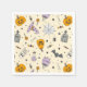 This cute Halloween pattern features a delightful mix of spooky and sweet illustrations scattered across a light beige background. The design includes playful Halloween elements such as a purple witch's hat adorned with stars, pumpkin-shaped candy, whimsical skulls and bones, and lollipops. Additional spooky touches include spiders hanging from webs, bats, tombstones, and potion bottles labelled "Magic." Small stars and polka dots fill the gaps, giving the design a cheerful and fun vibe. The soft colour palette, including purples, oranges, and yellows, adds to the charm, making this pattern perfect for a lighthearted Halloween celebration.