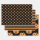 Cute Pumpkins Mixed Halloween Wrapping Paper Sheets include assorted designs with matching colours for your spook party. Two sheets have black background with pattern of orange jack o lanterns and one sheet has black and orange stripes.