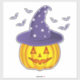 Cute Halloween sticker features purple flying bats and an orange pumpkin wearing a purple witch hat filled with sparkly white stars.