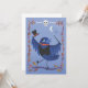 A Prussian blue feathered black bird is dressed formally in a satin vest, orange bow-tie, top hat and cane as he dances upon a tree branch under the white crescent moon. Original illustration by Noël Snow.