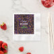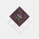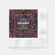 Delightful smiling jack o lantern pumpkins on a deep purple bokeh background, Happy Halloween greeting in white font and name in neon green decorate these coined cocktail paper napkins. Easily make text changes using the Template provided. Ideal for Halloween party or small October gathering. This napkin is 4.75"x4.75" folded, sold in sets of 50 and printed in full colour on your choice of white or ecru. Standard or coined napkin styles available in this size. More choices are available