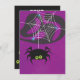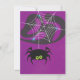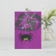 A black spider with bright green eyes dangles from a web against a vibrant purple background. The web features sparkling points, adding a whimsical touch. These custom cards are affordable invitations, classroom handouts, trick-or-treat, or party favours. Available with or without envelopes. Teachers, give your students a special card from your classroom. Provide trick-or-treaters with a fun candy alternative. Use as an invitation or give each child a keepsake to take home from your party. Digital image of hand-painted paper. Backside: Add custom text.