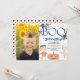 This colourful and festive birthday party invitation features a cute Halloween theme for kids. The left portion features a large image of the birthday kid which you can replace with your own custom photo. and the right portion features the party information and illustrations. The word "BOO" is printed at the top with several spiderwebs and little spiders are hanging from it. A pumpkin, mummy, and Frankenstein are placed along the bottom. Two bats, one with a witch's hat are flying near the top. A faded border of orange and black stars frames the invitation.