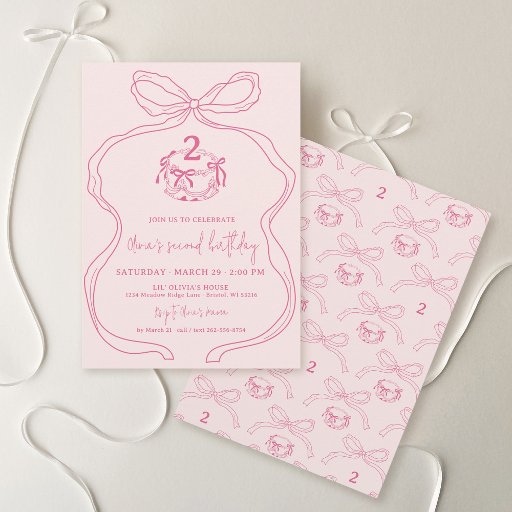 Cute Hand Drawn Bow Pink Girl Photo 1st Birthday Invitation