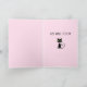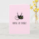 Humourous card shows a hanging cool black cat with green eyes and a curling tail. The text below read "Hang in There" in a full-cap modern, arts and crafts font. The inside of the card reads "Get Well Soon." Background colour is pink.