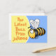 Share the latest buzz! This cute bumble bee is drawn in happy cartoon style with a yellow and blue background.
