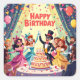 Cute Happy birthday masquerade theme with balloons, cake and confetti.