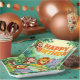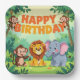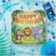 Cute Happy Birthday safari theme with monkeys, lion and elephant in the jungle.