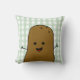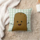 An adorable, cute happy brown cartoon potato with little black dots for eyes, stick arms sticking out from either side of his body and a big happy smile. The background is a classic, green and white gingham check pattern.