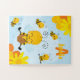 Add a cute touch to your little one's game collection with this adorable bumble bee jigsaw puzzle. Puzzle features five happy bees, one with honey, and the others buzzing around. There are also yellow and orange flowers and a soft blue background. In the corner there's a place for your young kid's first name and monogram initial.