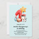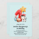 Birthday party invitation with an adorable image featuring a smiling cow, with a gold star balloon and some cake and a present.