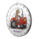 This funny brown cow is driving a red tractor. Lots of fun for the farmer or cow lover!