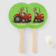 Cute happy cow driving a red tractor cartoon hand fan