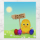Cute Easter illustration featuring a little chick holding a wooden sign with Happy Easter greeting, sitting in a flower field next to coloured Easter eggs.