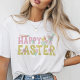 Personalised, trendy and cute hand lettered typography Happy Easter T-shirt with hand painted bunny, chick, flowers, decorated eggs and carrots in vibrant spring colours. Original art by Leslie Larson.