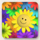 Adorable and cute yellow happy face flower resting on a bed of bright neon coloured flowers. Colourful and cheery.