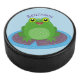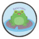 This cute happy green frog sitting on a purple lily pad is bright and adorable. Lots of amphibian fun drawn in happy cartoon style.