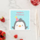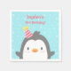 Planning a winter December birthday party? How about a penguin themed one? These paper napkins is perfect for a penguin party! It has a cute and happy grey penguin that is wearing a little party hat! A stars and dots pattern light blue background. Personalise with your party message!
