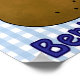 Adorable custom poster featuring a cute brown cartoon potato with a big happy smile, dots for eyes and stick arms. The background is a classic pattern of blue and white check, gingham. Below the potato in blue lettering is a template to add your name or other text to personalise.