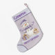 Celebrate the joy of the season with this whimsical snowman Christmas stocking! The cute snowman design, complete with a purple hat and scarf, is set against a dreamy light purple snowy backdrop with presents. Personalise the top with your child’s name for a unique holiday keepsake, while “Merry Christmas” below adds a festive touch. Ideal for holding gifts or bringing holiday charm to your decor. Don’t wait—make this personalised stocking part of your family traditions today!
