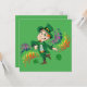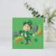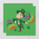 Invitation with an Illustration of a cute happy smiling and dancing leprechaun, he's wearing a green suit and a top hat and is surrounded by rainbow-coloured splashes