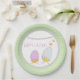 NewParkLane - Easter paper plates, with two cute Easter chicks just hatched out of their egg shells in pastel pink and purple and one in soft blue. With two cute little orange butterflis and a pastel coloured bunting flag. With a frame with a pink border against a pastel green and white polkadot background.