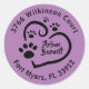Paw prints on heart custom round return address stickers with lavender background. Decorated with a cute swirly heart with paw prints on the heart and around. The name is printed in pretty cursive script in the middle of the heart while the address is neatly set in a circle around the central heart design. Personalise it by replacing the sample name and address with your own or custom mailing information.