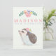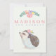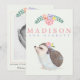 Our cute photo birth announcement card introduces your beautiful baby girl with her name on the front with pink florals and a cute hedgehog. Customise the back with a newborn photo and script text to feature your baby's important birth information, and parent names. The photo is framed by a soft rose pink frame topped with watercolor pink, purple, green and yellow flowers.