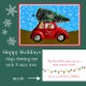 Fun Happy Holidays greeting card. Two dogs, a golden retriever driving and a husky riding in the back wearing a yellow knit cap. The cheerful holiday pups are enroute, in their small bug-like car, transporting their Christmas tree home for the holidays. The tree is a vintage bottle brush tree. The car is bright candy cane red and has Happy Holidays displayed on the side. The background has a bright blue sky with snowflakes falling. The greeting inside is preset but easily changed. A string of Christmas lights runs across the card, separating the holiday greeting from your name. On the back there is a template for you to add the year.