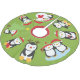 Cute Holiday Penguins Festive Christmas Tree Skirt for Xmas featuring green and red colour with cute cartoon illustrated penguins wearing Santa hats and reindeer antlers, a snowman, and christmas tree.