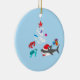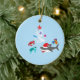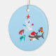 Ornament with cute ocean Christmas theme design. The design consists of a cute shark wearing a Santa hat and carrying Christmas presents, cute green sea turtle and cute red crab. The design is completed by a small white coral arranged as a Christmas tree and decorated with blue, pink and purple seashells and a red starfish. The design is customizable.