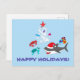Postcard with cute ocean Christmas theme design. The design consists of a cute shark wearing a Santa hat and carrying Christmas presents, cute green sea turtle and cute red crab. The design is completed by a small white coral arranged as a Christmas tree and decorated with blue, pink and purple seashells and a red starfish. The text says "Happy Holidays!". The design is customisable and you can personalise the text.