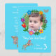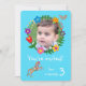 Personalise this cute Horse, Butterflies, and Flowers Birthday Party Invitation for a boy who is turning 3 (can be customised for any other age). Turquoise blue background more suited for boys. Invitation has a round space framed by a floral wreath for the kid's photo, a horse and a butterfly on the front, and one larger butterfly on the back. Make sure you personalise both front and back. All the text can be customised. As it is, it reads the following: