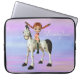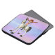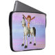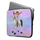 Pretty personalised laptop sleeve with an adorable little girl poser doll with flying pigtails / braids on a cute happy horse / pony on a pretty, colourful pink and blue magical background with twinkling stars. Children will love these happy characters - a perfect gift for girls! Personalise or remove the text. Another cool product from Groovy Graphics.