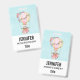 A name tag with an adorable design featuring a watercolor illustration. A hot air balloon decorated wuth pretty red and pink flowers. A cute little white baby bear sits in the basket. Image on a light blue background with your text on a white background.