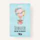 A name tag with an adorable design featuring a watercolor illustration. A hot air balloon decorated wuth pretty red and pink flowers. A cute little white baby bear sits in the basket. Light blue background.