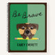 This Be Brave Notebook is for those who welcome adventure and are brave when faced with uncertainty. The design features a Mocha coloured dog holding a yellow pencil on a two-toned emerald green background. The simple illustration style of this journal provides a modern look that is perfect for learners and educators. Add your own name to the cover to make it your own. Be Brave!