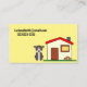 This is a cute house sitting and pet sitting business card featuring a cute cartoon house print and a cartoon puppy on a light yellow background. Your name and titles go on one side and your email and phone number go on the other side.