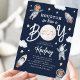 Blast off to lands unknown, embark on a journey where the stars are your guide! Join us for the cutest baby shower you ever did see, with our adorable Woodland Animal Astronauts. 'Houston, we have a Boy!' Set against a backdrop of the navy blue cosmos, this invitation is sure to light up your day just like the magical stars that adorn it. Hop aboard the rocket to cuteness overload!