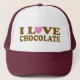 I Love Chocolate hat has pink heart and lots of affection for the yummy confection we call chocolate. Whether it's hot chocolate or a bon bon or truffle, if it's chocolate, it's delicious.