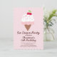 Modern & cute vanilla ice cream & strawberry ice cream cone with sprinkles and a red cherry set on a pale pink background. Flip our fun girls summer pool party birthday invite over to find a pink stripe back for an extra special touch.