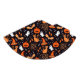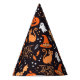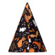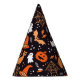 seamless pattern of Halloween illustrated cartoon on a black background. The cartoon characters include pumpkins, ghosts, bats, candy, spider webs, and stars. The icons are all drawn in a simple, cartoony style. The pattern is repeated seamlessly, so it can be used to fill a large area, such as a wall, fabric or a piece of paper. this pattern is good for party hats, wrapping papers, wrapping bags and more. Try this Party hat, you won't regret it.