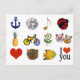 A cute graphic composition: anchor, diamond, musical-note, ladybug, pineapple, bicycle, flower, cats, heart, owl, fish, i-love-you...