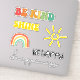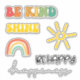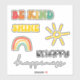 A simple set of cute and inspirational stickers, with a minimalist and modern typography. Includes "Be kind", "Shine", "Be happy", "happiness", a rainbow and a sun doodle.