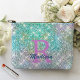 Cute iridescent unicorn blue faux glitter monogram Accessory Pouch. It is designed with elegant girly silver and iridescent faux glitter in unicorn, rainbow, teal, aqua, turquoise and green.