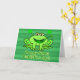 A cute green frog for St Patrick's Day. This funny St Paddy's design features a frog with shamrock antennae and shamrocks on its leg, and it's also catching a clover on its long green tongue. The green text says, "Hoppy Saint Patrick's Day." The inside text reads, "Have a leaping good time," but you can customise it however you'd like. The frog sits on a green striped background. This is an adorable design for anyone who likes animals / animal puns and wants to send a lucky greeting card for St Patty's Day.