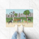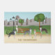 Destei's original cartoon illustration of five cute Italian Greyhound breed dogs in a park scene. The dogs are all in different coat colours. There is a fawn and white, black and white, blue and white, seal and white and a cream colour Iggy in the image. The park has an old style lamp, a wooden bench, green grassy hills, two trees and a city skyline view on the back. There is also a small tennis ball on the ground. The sky is blue. There is also a personalizable text area for a family name or other custom text such as: "Welcome".